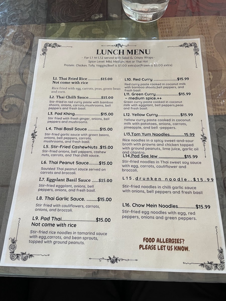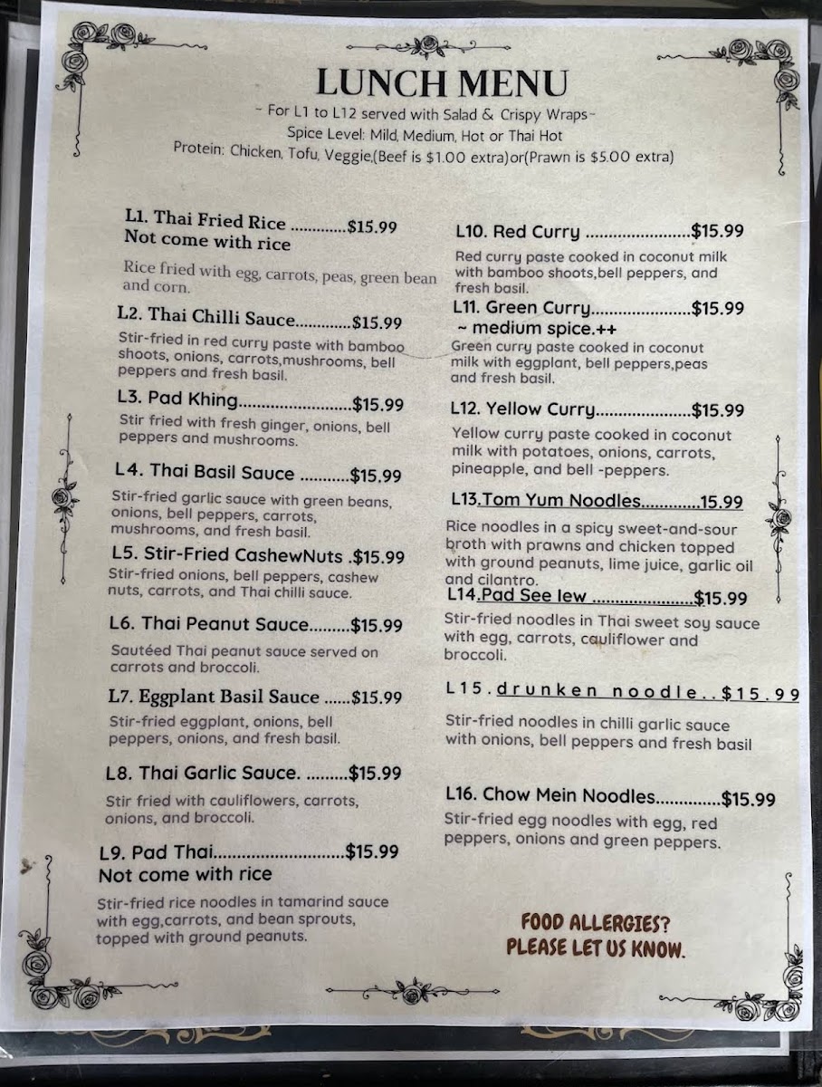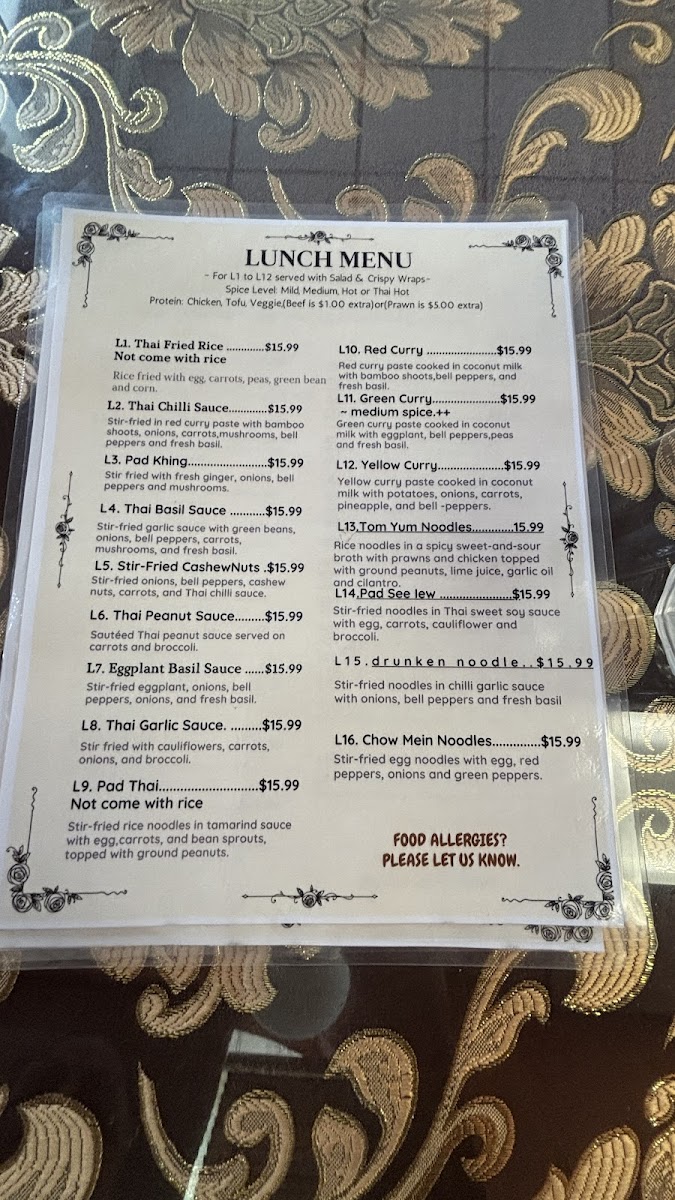 The overall feel of the food matches the intimate, family-friendly atmosphere of the restaurant, making it a welcoming spot for everyday moments that call for simple, satisfying flavors. Whether you’re enjoying a midday meal or winding down with some Thai Iced Tea, the menu captures the essence of traditional Thai cooking with dishes that are both familiar and warmly inviting.
