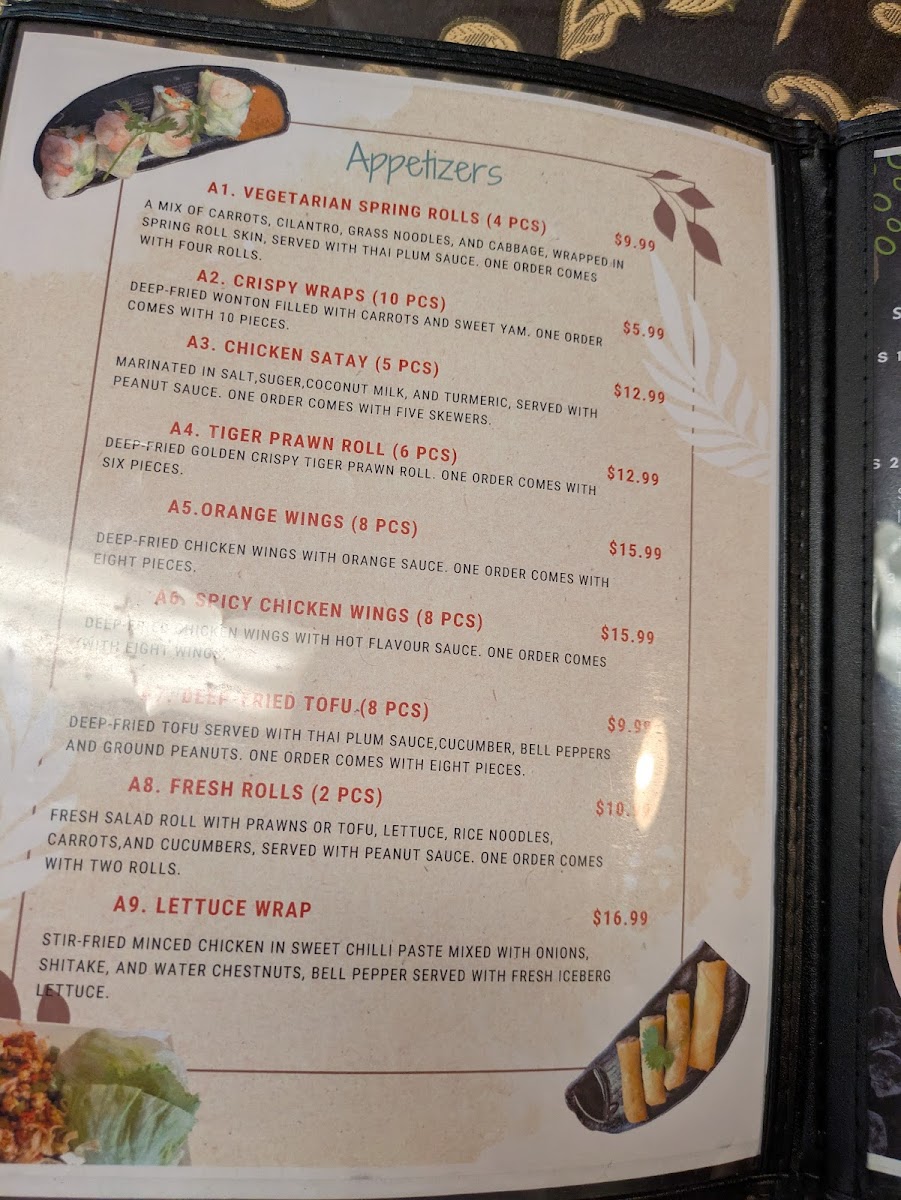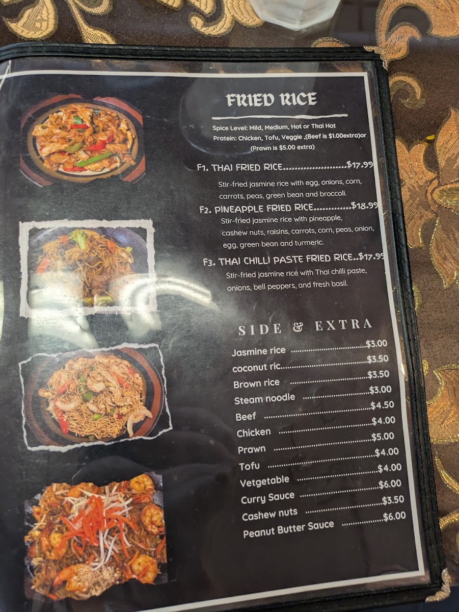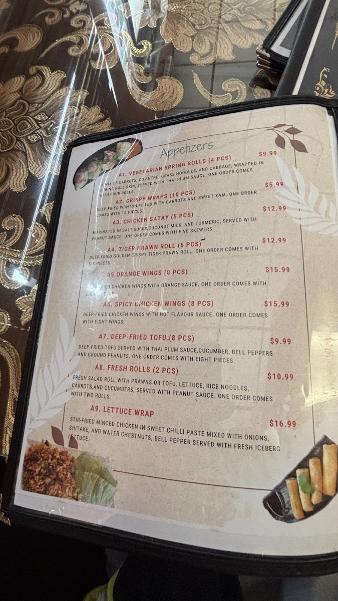 Menu highlights include comforting choices like Massaman Curry Chicken and Red Curry that pair perfectly with steamed jasmine rice, alongside classics such as Pad Thai and Thai Fried Rice, available with your choice of chicken, beef, or tofu. Light starters like the Soft Roll and Spicy Chicken Wings complement the mains and create a balanced dining experience.